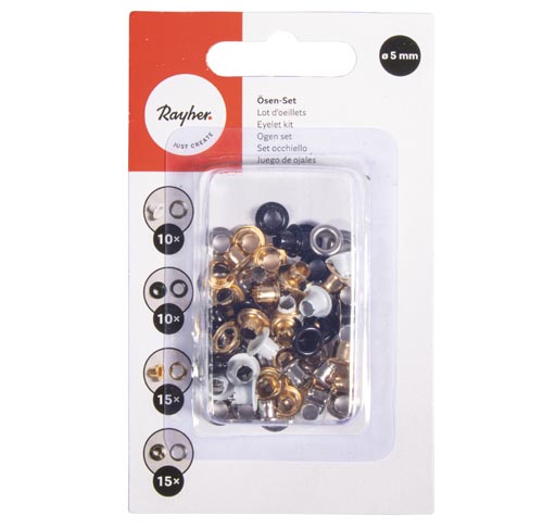 Kb. ø 5 mm, 10 x fehér, 10 x fekete, 15 x ezüst és 15 x arany, 50 darabos készlet. Alkalmas a 674144 cikkszámú lyuk- és fűzőfogóhoz.