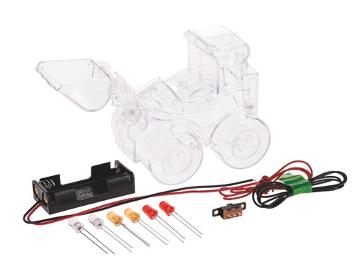 Az akril alaplap két narancssárga és két piros villogó LED-del, valamint két élénk fehér LED-del van felszerelve. A tudásszinttől függően az áramkör forrasztható vagy sodró vezetékekkel csatlakoztatható. Az áramellátást két 1,5 V-os AAA elem biztosítja (külön kell megrendelni), melyeket a tolókapcsolóval ellátott elemtartóba kell helyezni. Az átlátszó akril testet, külön kézműves foglalkozáson, festékekkel lehet díszíteni. Méretek: kb. 120 x 70 x 60 mm