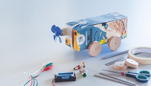 Ez a készlet 10 tejesdobozos jármű megépítéséhez elegendő alapanyagot tartalmaz. A különböző kerékátmérők és tengelyanyagok eltérő gördülési jellemzőket tesznek lehetővé a járművek számára. A különböző méretek képességeivel és a hozzá kapcsolódó következményekkel ismerkednek meg a gyerekek.