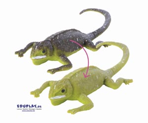 A kaméleonhoz hasonlóan ez a gyík a sötétből (hidegből) világosba (melegbe) változtatja a színét. A hatás azonnal látható, ha a gumijátékot különböző hőmérsékletű vízbe helyezed, vagy napfényre teszed. Puha műanyag, vegyes színű, méretek: 120 x 50 x 22 mm, 1 darab
