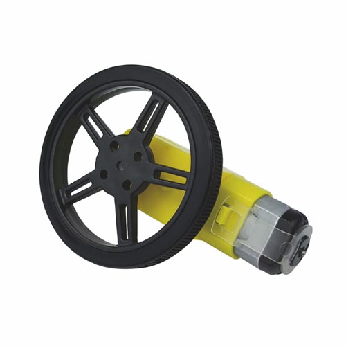 Egyenes kialakítás, két kimenet. 100 mm-es csatlakozókábellel, nyitott végekkel. 2 részes. Műszaki adatok: Üzemi feszültség: § 3 - 6 V DC Max. áramfelvétel: § 160 mA Max. fordulatszám 6 V-on: § 200 ford/perc Kimenő tengely: § ø 5,4 x 3,6 mm lapított Motor méretei: § 70 x 38 x 22 mm Kerék méretei: § ø 60 x 8 mm