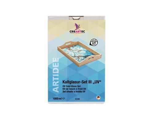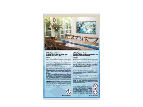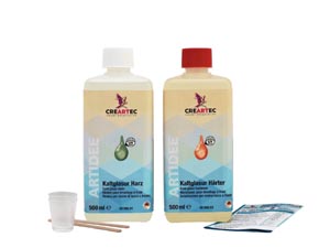 Két komponensű átlátszó hideglazúr UV és időjáraás ellenálló, mosogatógépbe alkalmazható, víz és dörzsölésálló. A két komponens összekeverése után (gyanta : keményítő 1: 1 arányban) tükörsimára keményedik, karcolás ellenálló felületet képez. Fa kerámia, fém, gipsz, hungarocell, beton és hasonló felületekre alkalmazható (kivétel műanyag!). Átlátszó lakkrétegként vagy színezve (axrylfesték, alkohol) egyedi színes bázis rétegnek is szolgálhat. Maximálas rétegvastagság 2 cm lehet. Az anyagszükséglez kiszámítása: modell szélessége x modell hossza x 0,158 = szükséges hideglazúr mennyiség ml - ben. A csomag tartalma: gyanta, keményítő folyadék, mérőpohár, keverő pálcikák, 5 részes készlet, 100 ml