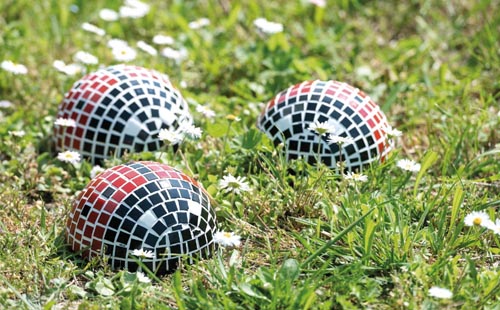 Tartozékok: 3 db hungarocell gömb kb.ø 120 mm, 2 x 200 g piros üveg mozaiklap kb. 10 x 10 x 4 mm, 2 x 200 g fekete üveg mozaiklap kb. 10 x 10 x 4 mm, 12 db fehér üveg mozaiklap kb. 10 x 10 x 4 mm, 2 x 80 g átlátszó szilikon ragasztó, 1000 g fehér időjárás ellenálló mozaik fúgapor, leírás német nyelven.