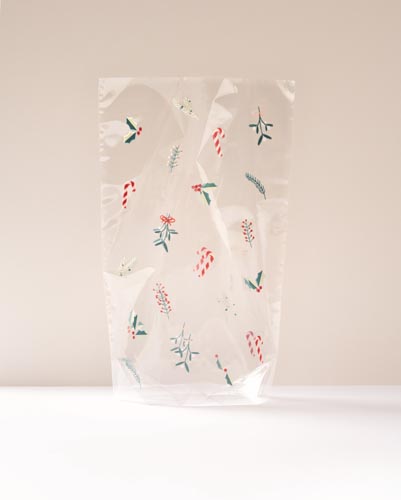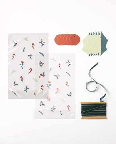 Tartalom: 6 db élelmiszerbiztonságos, polipropilénből készült celofán zacskó kb. 145 x 235 mm, 6 db zöld és 6 db piros papírcímke, kb. 1 m-es bársonyszalag, 19 darab