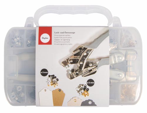 Jól kidolgozott vasból készült szerszám ø 3 és 5 mm-es lyukakhoz alkalmazható. Stabil műanyag tároló dobozban. ø 3 és 5 mm-es szegecsekkel - midegyikből 80 db (összesen 160), négy különböző színben: fehér, fekete, ezüst és arany. Ez az univerzális szerszám precíz és könnyedén lyukaszt sokféle anyaghoz alkalmazható pl. papírt akár 500 g/m²-ig, bőr, szövet vagy fólia.