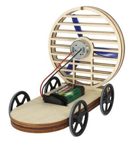 A laserrel előre vágott részeket egyserűen össze lehet illeszteni. Mihelyt a 9V elem a motorral érintkezik, a propeller forogni kezd és a hajtóerő mozgásba hozza a járművet. Különösen sima felületen halad gördülékenyen. A csomagban az építő elemeken kívül enyv és az elem is megtalálható. A kész járgány kb. 150 x 107 x 135 mm. Leírás német nyelven.