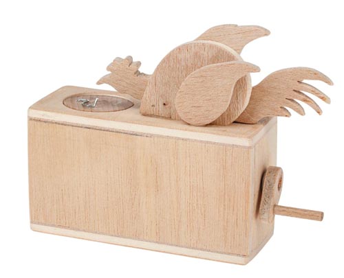 A tekerő mozgás által fel le mozog a tyúk feje, közben jól megfigyelhető a műKödésbe hozó mechanizmus. A szükséges munkafolyamtok: fúrás, frűszelés, csiszolás, reszelés, enyvezés, bejelölés és összeépítés. Leírás német nyelven.