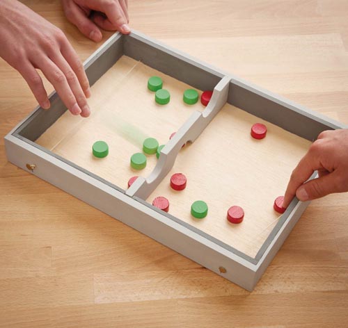 A gyorsabb győz! A játék célja, a saját korongokat a gumi segítségével, az elválasztófalon található réseken át, az ellenfél pályájára lőni. Részletes leírás .