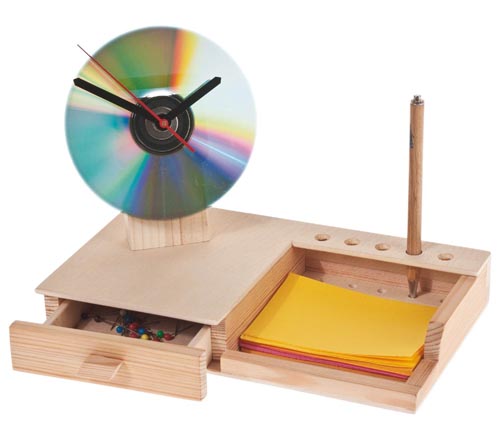 Ötletes asztali irodaszer tartó - golyóstoll, ceruza, gémkapocs, radírgumi és jegyzettömb részére. Egyedi ajándék jó barátok meglepetésére. A kvarcóra-szerkezet mutatókkal, az üres CD (óralapnak) és minden szükséges fa elem megtalálható a csomagban. A pontos leírást követve, könnyedén összeépíthető, hasznos dekorációs kellék. Méret: 240 x 140 x 170 mm. Az elemet külön kell megrendelni.