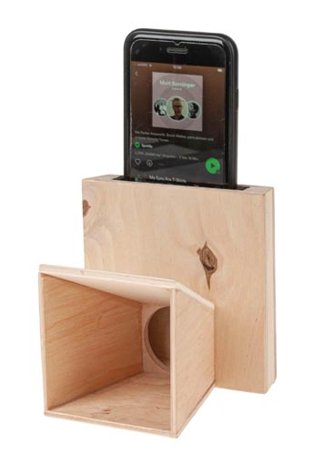 A telefon vagy Smartphon hangjának a kierösítésére alkalmazható egyszerű megoldás. Minden elektronika és kábel nélkül, csak a tölcséren keresztül emeli a készülék hamgerejét. A szükséges munkafolyamatok: fúrás, fűrészelés, reszelés/csiszolás, enyvezés, jelölés és összeépítés. Leírás német nyelven.