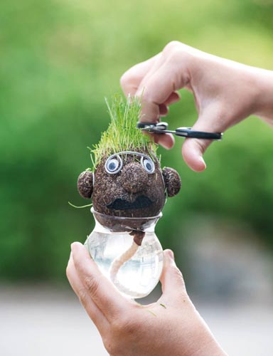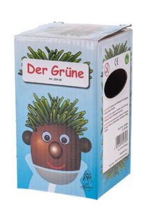 A kopasz fejecskét először jól meg kell öntözni, majd a vízzel megtöltött edényre (kb. ø 70 x 70 mm) kell helyezni, hogy a zsinór nedvességet szívhasson magába. Egy pár nap után láthatóvá válnak az emberke fűhajszálai.