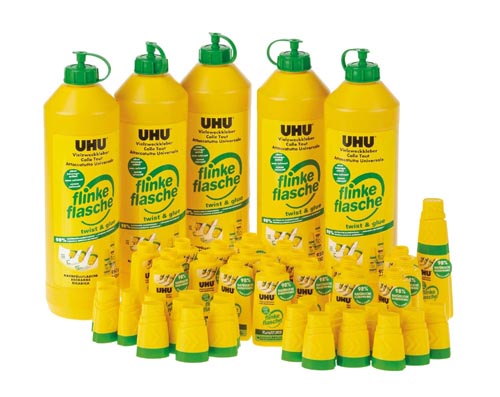 Oldószer nélkül. Gyorsan, tisztán ragaszt. A puha, praktikus műanyag palack 88%-ban megújuló alapanyagokból készült. A palack újratölthető, a praktikus ragasztófej lehetővé teszi a pont-, vonal- és felületragasztást. A ragasztó bőrgyógyászatilag tesztelt. Ideális karton, papír, filc, parafa, szövet, fa egymáshoz ragasztására, valamint fémre, porcelánra, üvegre, hungarocellre és sok műanyagra. Csomag tartalma: 5 db utántöltő palack UHU gyorspalack, egyenként 950 g-os és 20 db 40 g-os üres palack.