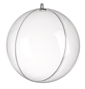 Két összeilleszthető részből álló, átlátszó acryl gömb, akasztóval. 15 mm lyukkal égősor izzóknak.