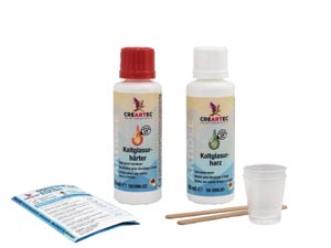 Két komponensű átlátszó hideglazúr UV és időjáraás ellenálló, mosogatógépbe alkalmazható, víz és dörzsölésálló. A két komponens összekeverése után (gyanta : keményítő 1: 1 arányban) tükörsimára keményedik, karcolás ellenálló felületet képez. Fa kerámia, fém, gipsz, hungarocell, beton és hasonló felületekre alkalmazható (kivétel műanyag!). Átlátszó lakkrétegként vagy színezve (axrylfesték, alkohol) egyedi színes bázis rétegnek is szolgálhat. Maximálas rétegvastagság 2 cm lehet. Az anyagszükséglez kiszámítása: modell szélessége x modell hossza x 0,158 = szükséges hideglazúr mennyiség ml - ben. A csomag tartalma: gyanta, keményítő folyadék, mérőpohár, keverő pálcikák, 5 részes készlet, 100 ml