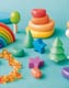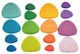 Lapos, egymásra tornyosítható kavics alakú fa építő részek a szívárvány színeiben. Más fa építő kockákkal is jól kombinálható. A legkisebb kevics mérete kb.40 x 60 x 25 mm és a legnagyobb kb. 95 x 115 x 25 mm.
