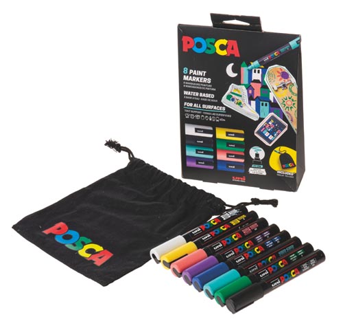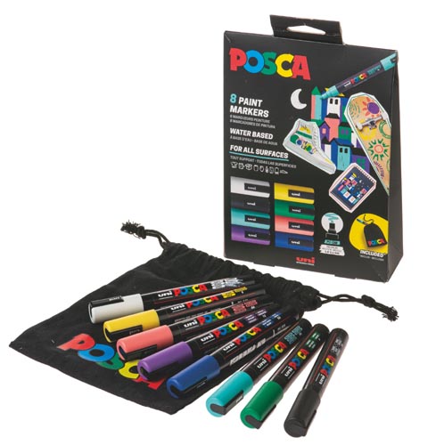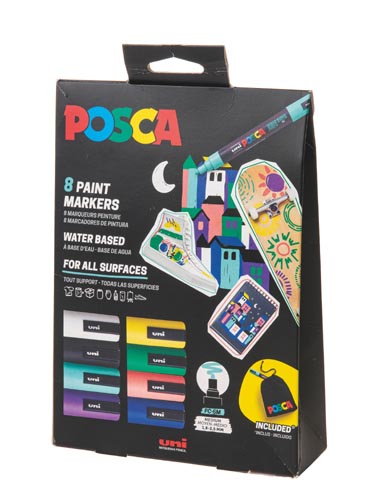 8 színben: fehér, fekete, sárga, aquamarin zöld, zöld, lila, kék, korall rózsaszín, POSCA textiltáskával együtt, fekete, kb. 200 x 170 mm. A hegy megfordítható és cserélhető. Festőhegy 1,8 - 2,5 mm, 8 darabos készlet.